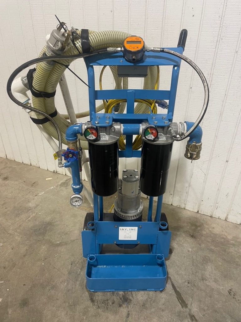 Hydraulic Filter cart capable of pumping 11gpm. This filter cart includes a bypass to not allow over pressurization of the system.