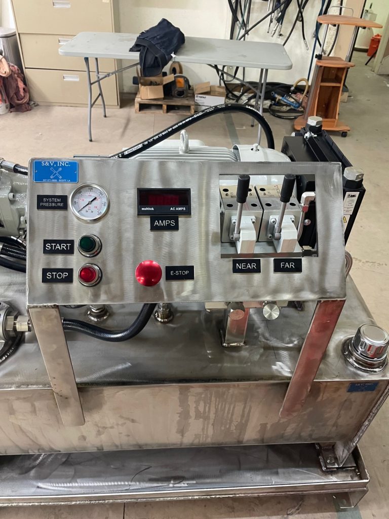 This HPU consists of one 15HP electric motor that drives a pressure compensated axial piston pump rated to 2,000psi at 18gpm. The system also includes a safety relief valve to prevent over pressurization. This equipment is mounted on a 60 gallon 316 SS reservoir/skid assembly.