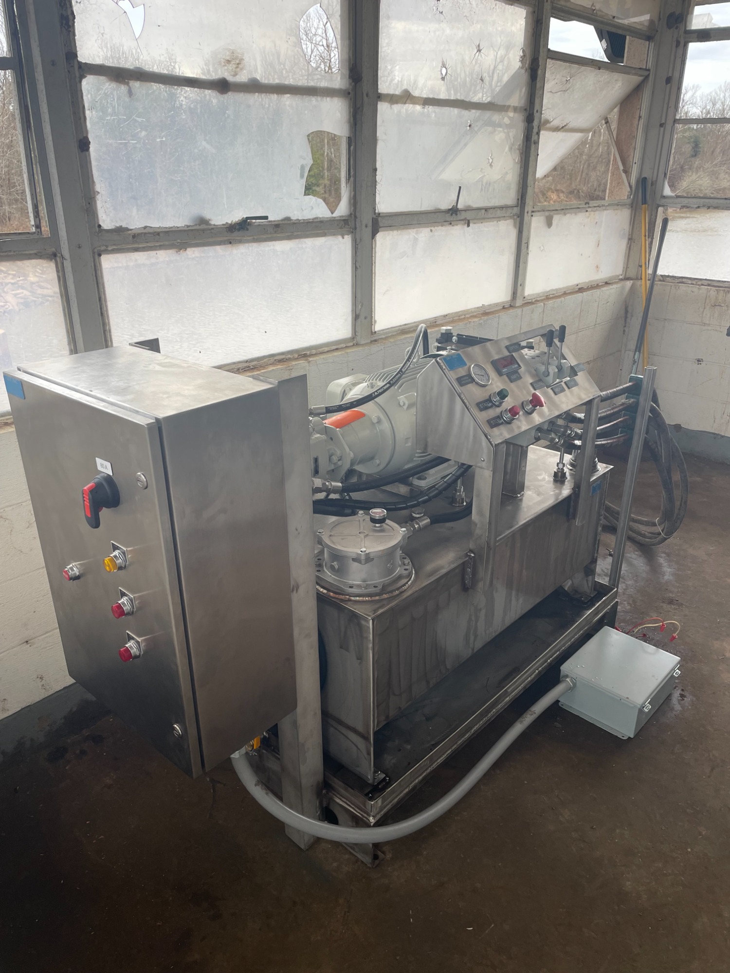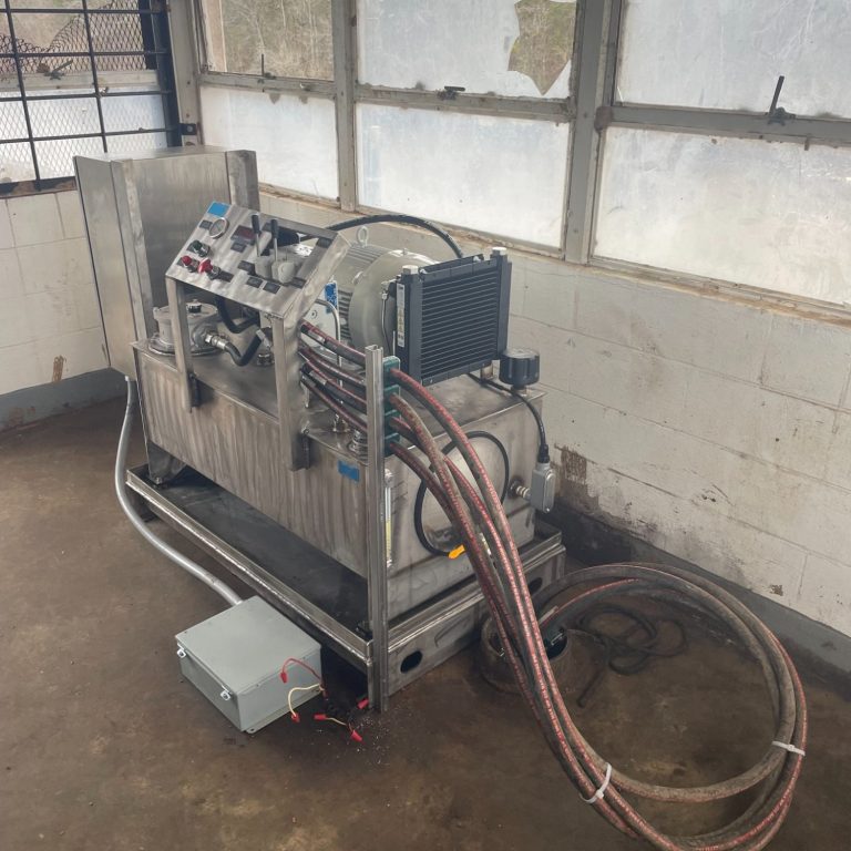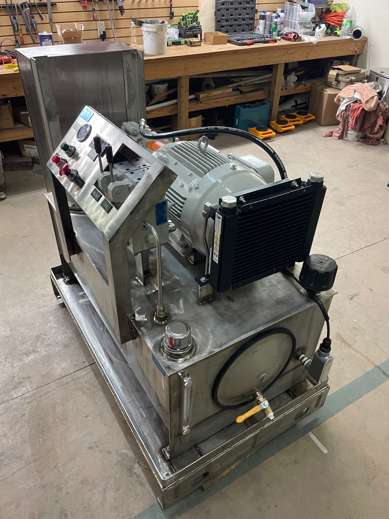 This HPU consists of one 15HP electric motor that drives a pressure compensated axial piston pump rated to 2,000psi at 18gpm. The system also includes a safety relief valve to prevent over pressurization. This equipment is mounted on a 60 gallon 316 SS reservoir/skid assembly.